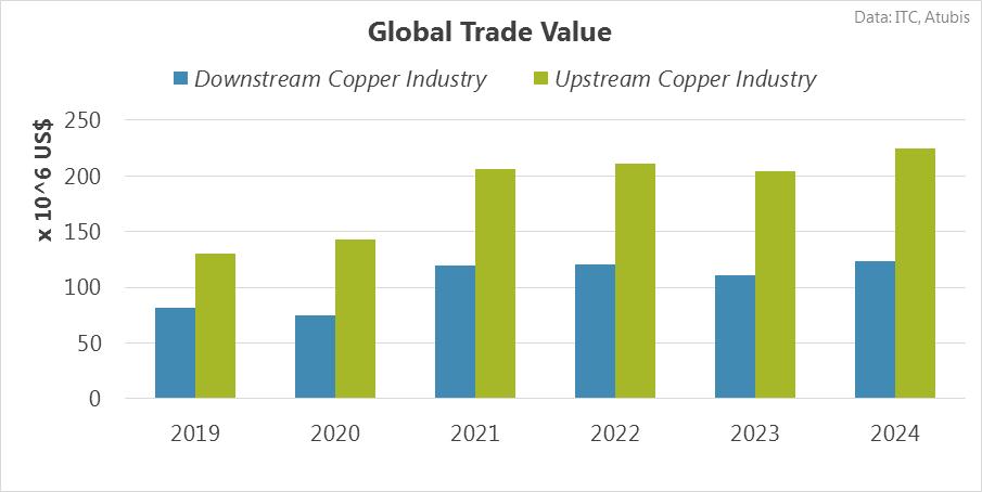 Between 2019 and 2024, Copper Wirerod played a noticeably smaller role in downstream trade than Copper Cathode did in upstream markets, and cathode kept its stronger position every single year.